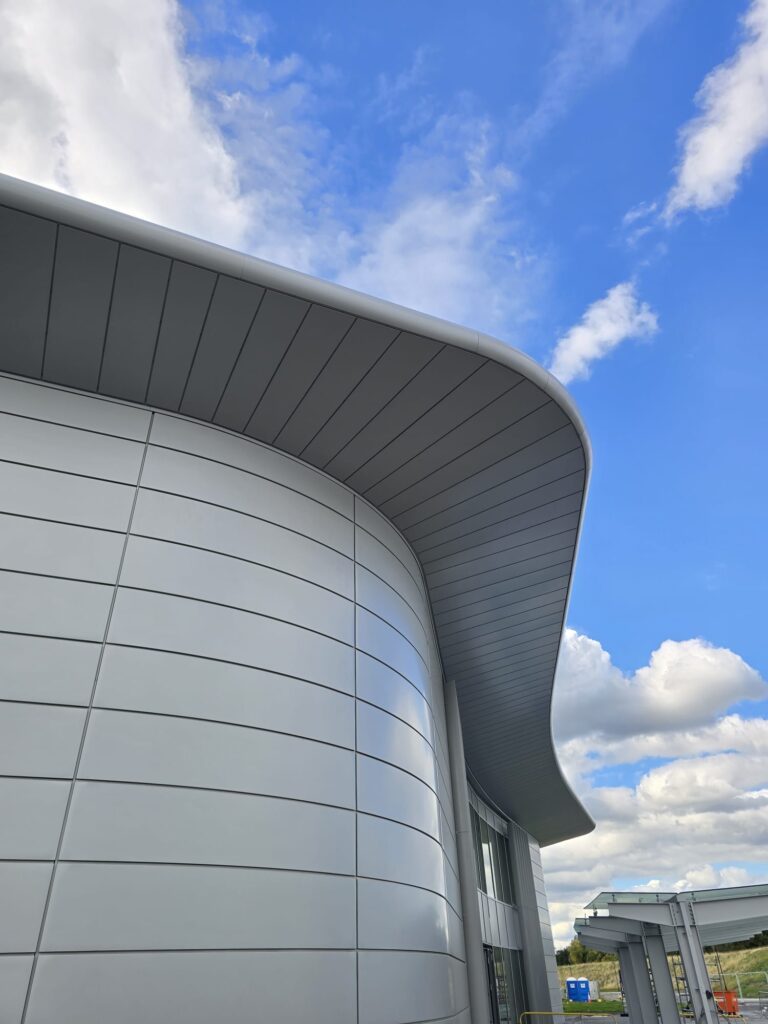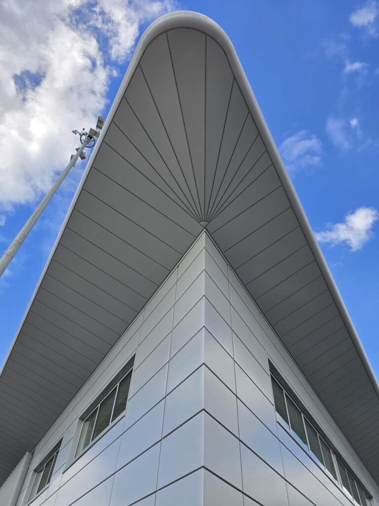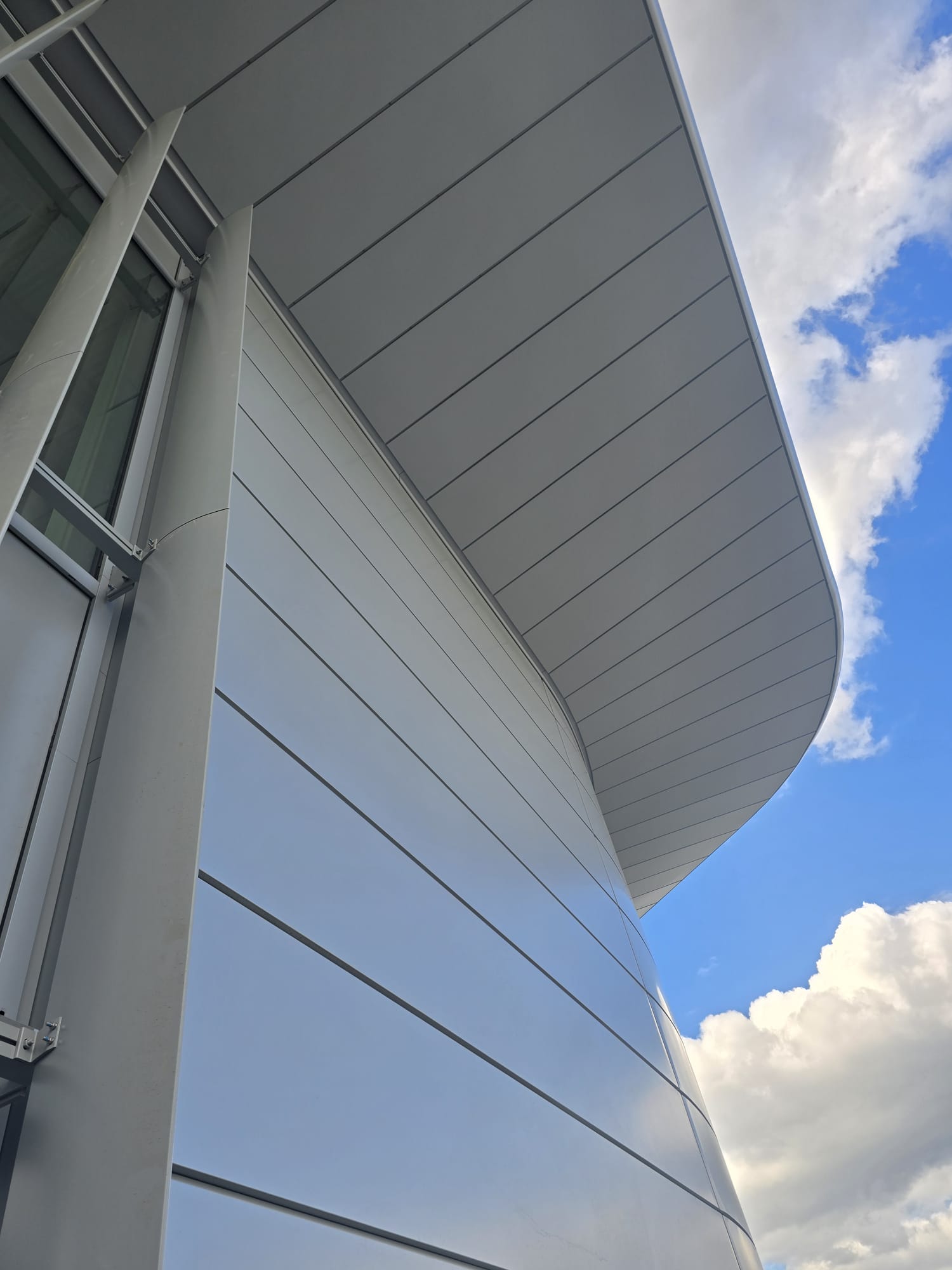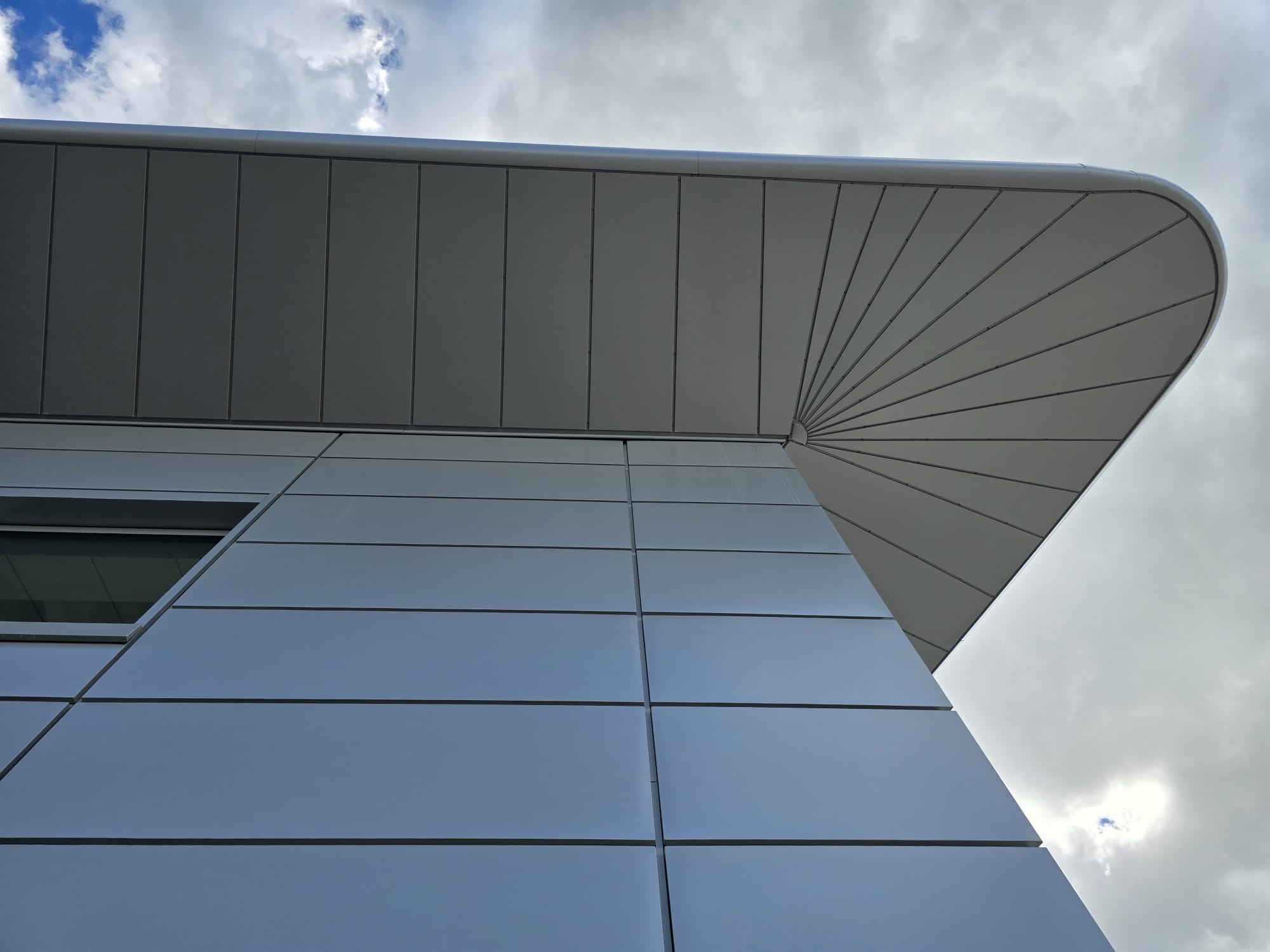 Our team produced each section to tight tolerances, ensuring the curved fascia aligned seamlessly with the soffits and surrounding structure. The final result delivers a smooth, continuous architectural flow that emphasises the visual impact of the airports exterior.